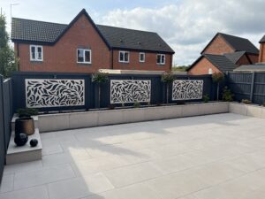 We then landscaped the garden with raised beds , new fencing and porcelain tiles throughout