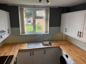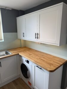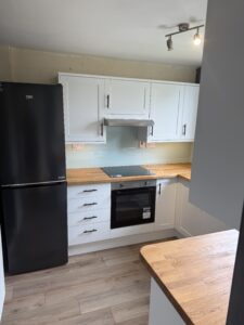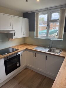 We removed the old kitchen and installed a new Howdens shaker units with solid oak worktops and an acrylic splashback all round , this was finished off with new oak effect LVT flooring